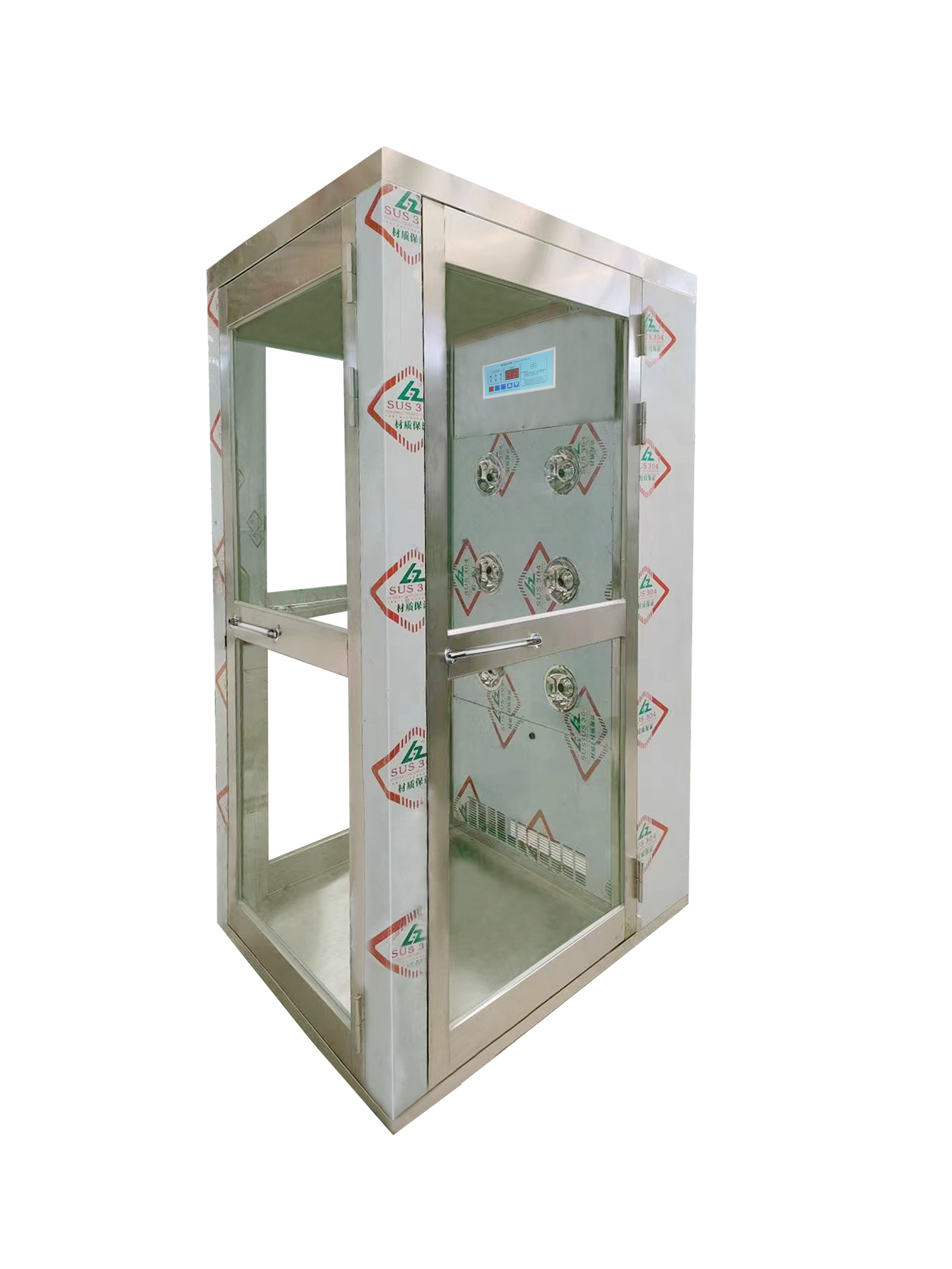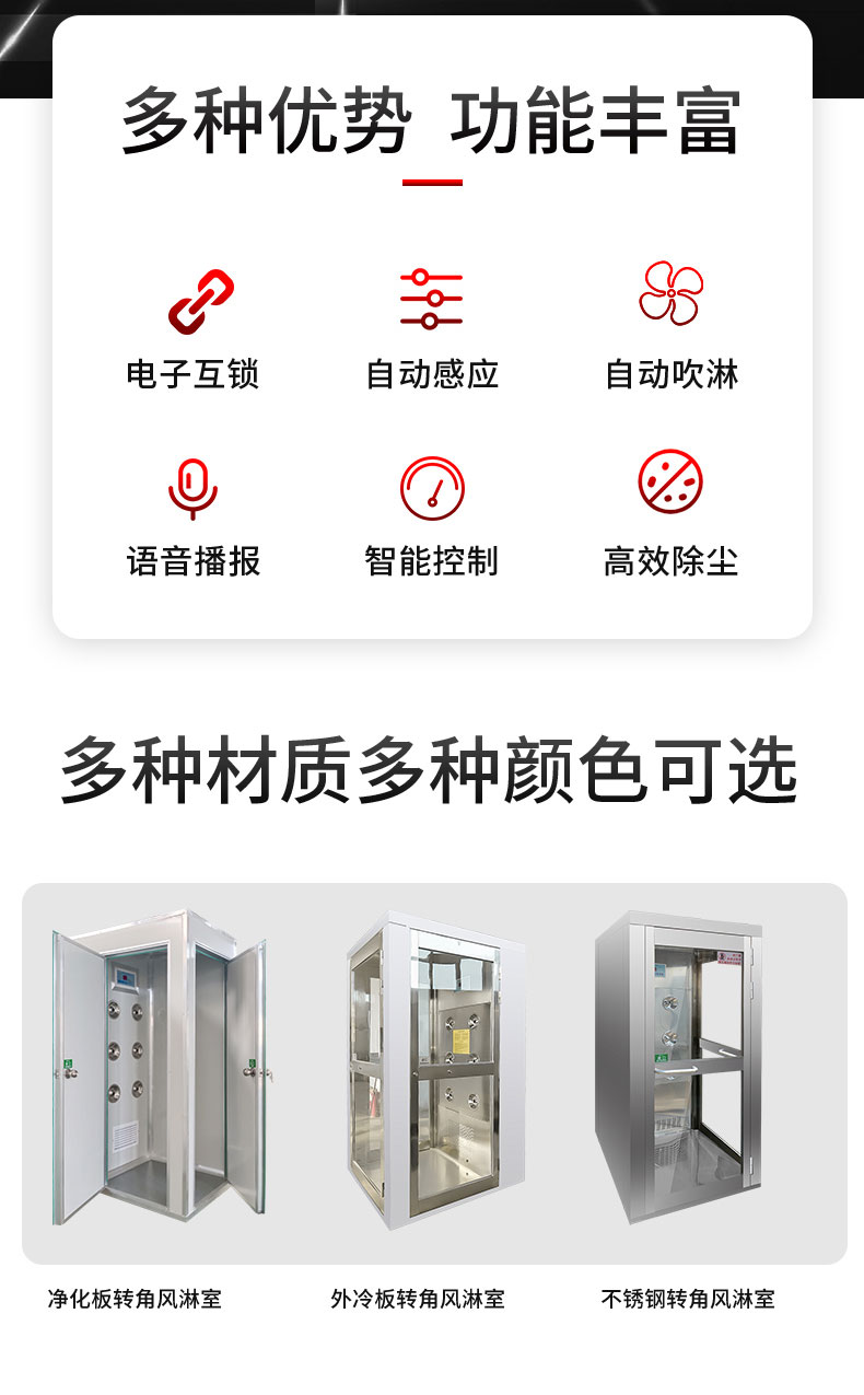 描述:轉(zhuǎn)角風淋室感應自動吹淋,透明視窗,內(nèi)部吹淋狀況隨時可見;軟件試控制器,LED顯示及設置吹淋時間,范圍0~99秒可調(diào),內(nèi)部采用圓的漸開線風道,高風速,低噪音。