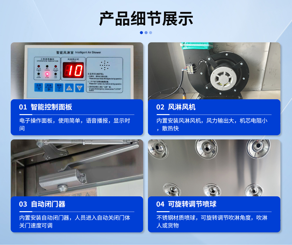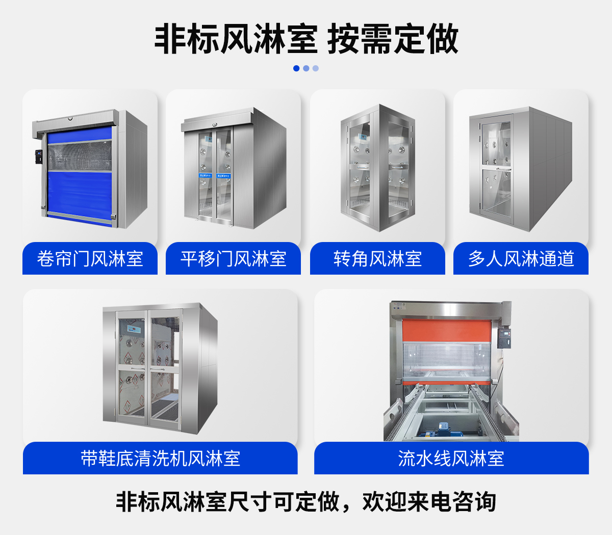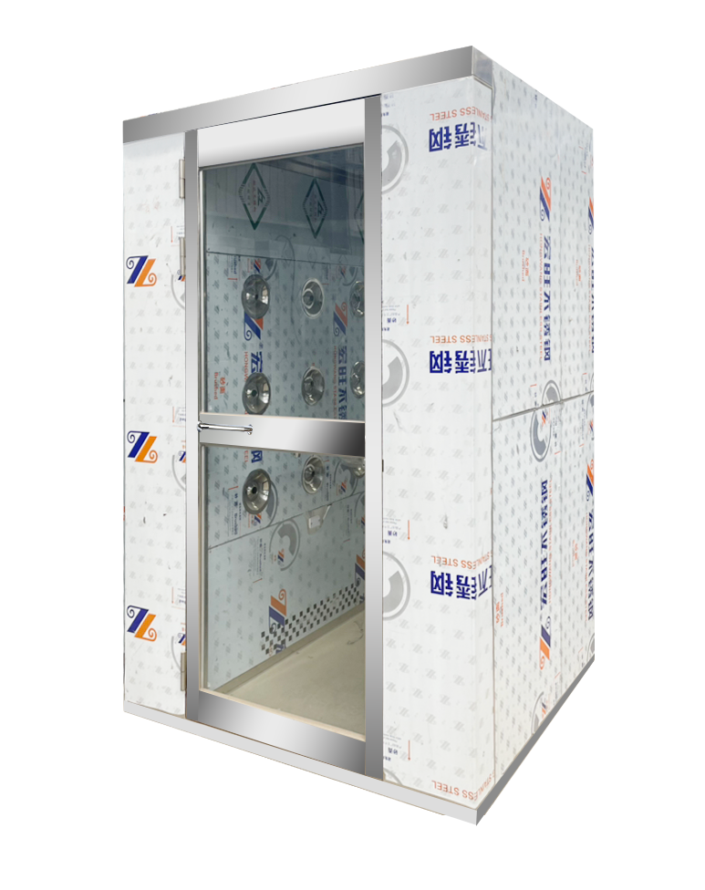 描述:風淋室是一種通用的局部凈化設(shè)備,安裝于潔凈室與非潔凈室之間。當人與貨物要進入潔凈區(qū)時需經(jīng)風淋室吹淋,其吹出的潔凈空氣可去除人與貨物所攜帶的塵埃,能阻斷或減少塵源進入潔凈區(qū)。